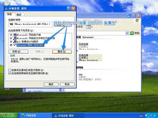 1、    WinXP为例 ,首先在桌面右键点击“网上邻居”选择“属性”打开到网络连接位置